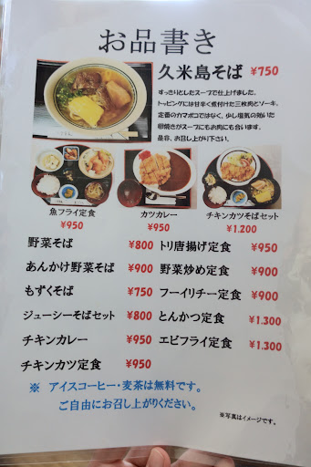 Read more色々食べたい場所がありましたが、当日何故かほとんどの飲食店が定休日。 嫁の実家が久米島なので、頼みの綱で来たこちらが空いていましたが駐車場は埋まっており嫌な予感しましたが、無事は入れました! メニューには載っていなかったですが、車海老フライ定食を注文。ついでに久米島そばも注文。2つ食べです。 久米島は車海老が有名で安く食べれます。 ここのお店は少し高く感じますが、来てみて納得の車海老の量。首都圏だとこの値段で食べれません。 頭が美味しい! たまたまだったのか少し車海老のフライは味が濃く少し残念でしたが、それでも満足。 久米島そばも美味しかったです。 沖縄そばはそこらのお店でおいてあるため、色々な味を楽しむのも良いでしょう。 万人向けのスタンダードなそばで毎日食べれるような味でした。 子供連れも多く、入りやすいのでおすすめです。 連れが食べていたジューシーは、ひじきが入っていないあっさりタイプ。 美味しかったです。 コーヒーや麦茶がセルフで飲み放題でありがたいお店です。 おすす...