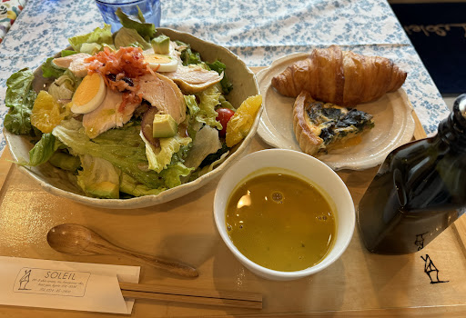 サラダ🥗は具沢山で見た目からボリュームあります。 具沢山なので飽きません。 クロワッサン🥐とキッシュ、スープが付いています。 食べ終わる頃には満腹になっていました🤭 食後に私はホットコーヒー☕️をいただきました。 お友達と久しぶりに会ったので話が尽きず…。 すご〜くゆっくりさせていただきました。