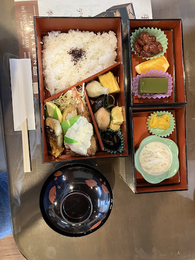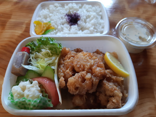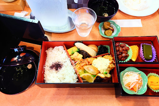 評価良いので妻同伴で訪問、平日火曜日12:00到着、駐車場は隣のAコープくにとみ駐車場と契約しているのでそちらを利用してくださいと案内されました。コロナ対策はアルコール、トイレは男女兼用ウォシュレット、4人椅子席3つ、6人椅子席1つ、8人椅子席1つ、カウンター椅子席8つ、店内は落ち着いた雰囲気でジャズが流れてます。お姉さんの応対、最初にお冷と紙おしぼりが出ました、温かいお茶はセルフです。お客さんが8割程入られておりにぎやか、幕の内1100円をオーダーしました。幕の内は四角い箱で提供され、引き出しを全て引き出して食べます、お吸い物が付いて、海老フライ、焼魚、チキン南蛮、煮物など色々と楽しめて美味しいですね。果物、デザートも付き、飲み物まで付いてこの値段はコスパ良いです。ぜひ再訪...