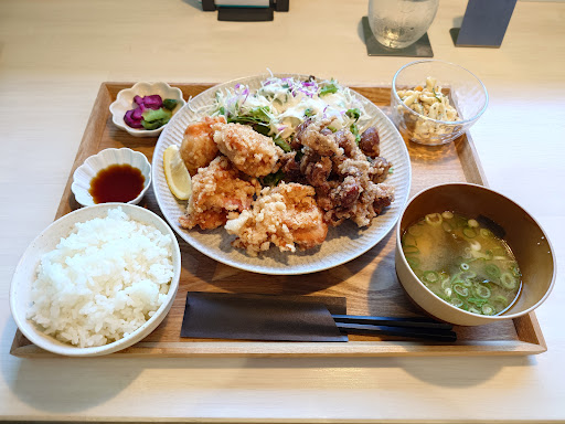 からあげはザクザクした食感の良いやつ 味は良かったのですがアツアツではなく温かいくらい 盛り付けに手間取ったのか 2種のからあげのタイミングが合わなかったのか 提供の連携が遅れたのか… 味噌汁はもう少し注いでほしいかな オープンして間もないので改善に期待です