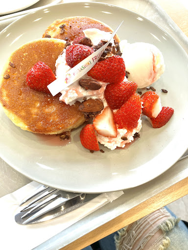 フワフワパンケーキではなく、表面がカリッと中はスポンジケーキのようでした。 イチゴやフルーツがたくさんのって、甘さ控えめの生クリーム、ヨーグルト味のサッパリアイス!とても美味しかったです。