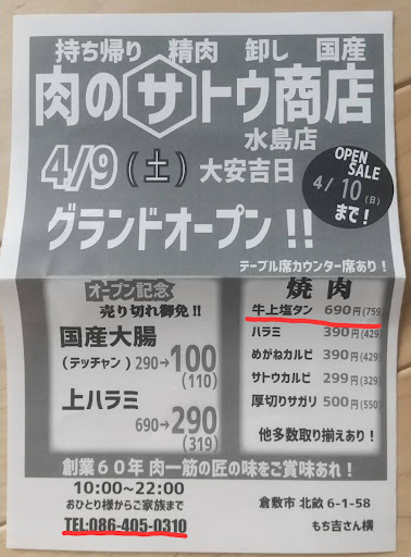 気付いたらできていた肉のサトウ商店に行ってみました ガツは少し柔らかめでおいしかったですタレで食べましたが塩ダレでも食べたいです 鶏モモはスーパーで買うくらいの価格ですがおいしかったですこれも塩ダレでも食べたいです ハラミ切り落としは少しスジっぽくあぶら多めでしたが安いです味はうまい サトウカルビは食べやすく万人向けで安いです定番商品だと思います あとタレとは別にニンニクがあったのですが今回は入れ過ぎたかも 最後にレシート見ると一人前の価格がメニューと違うような 会計は量り売りでの金額になってるのかな