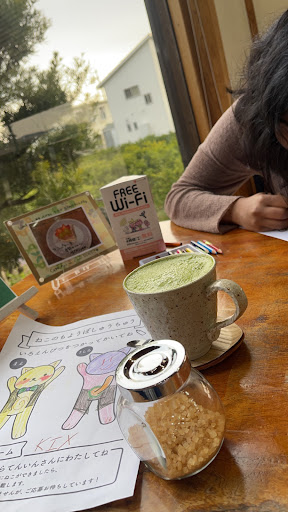 The pizza toast was delicious . It had tuna and cheese . The matcha latte also were creamy. Love this place. They sell handmade souvenirs . My friend and I enjoyed coloring cats.