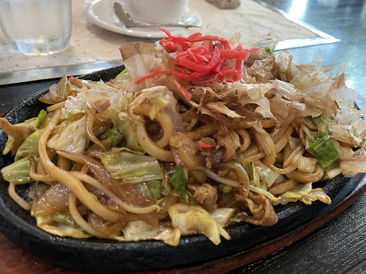 焼きそば・ライス共にデフォで大盛り仕様です(^^) 焼きそばはしっかり炒められ水分が飛んでいますね、好みです。ソースは少なめで野菜しっかり、おかずには最適な仕上がり、鉄板提供なので最後まで温々でした!