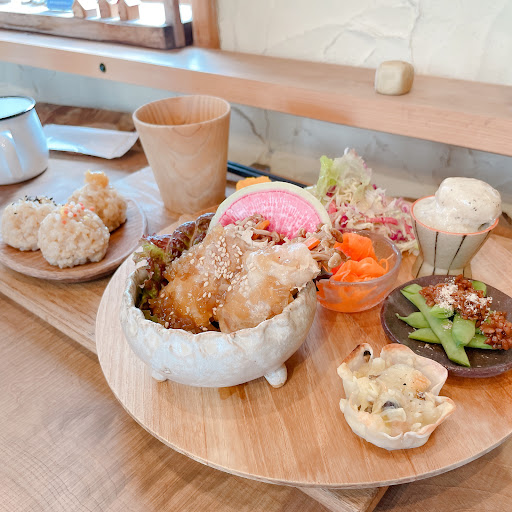 ランチは1種類のみのワンプレート+選べるドリンクで1000円。 木のプレートで8種類程のおかずと玄米おにぎりとお味噌汁が運ばれてきて、可愛すぎてテンション上がりました✨ お食事はどれもとても優しい味わいで手の込んだものばかりで本当に美味しかったです! 食後のコーヒーも木のコップで素敵でした♪しっかり豆の味がしてこちらも美味しい✨