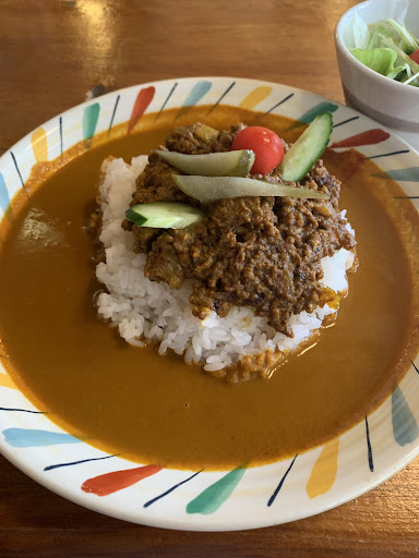 上司から聞いてお邪魔しました。 外見も内装も、喫茶店です。 灯りは暗めです。 テーブル席に女性2人、カウンターに常連の男性が1人がいらっしゃいました。 お店の方はカウンターに1人と料理をされている何れも女性の方です。 カウンターの女性は、常連さんとお話中で、メニューとお水はしばらくお預けでした。 注文したのは「夢カレー」です。 これは、お皿の上にご飯の山があり、山の上にドライカレー、周りにカレールーをかけたものです。 ドライカレーは「エスニックドライ(シナモン入り)」か「辛いドライ」、カレールーは「ノーマル」か「辛口」を選びます。 私は「辛いドライ」&「辛口」を選ぶと、10分弱程度で配膳されました。 カレールーはそれ程辛いと感じませんでしたが、ドライカレーはやや辛目でした。 でも、シナモンが入っており、後口がスッキリ爽やかでした。 後でうかがったら、他のスパイスと一緒に入れているということでした。 「効き過ぎてますか?」と聞かれましたが、これはお店の特徴ですし好みもありますから何とも言えません。 ほかにはトーストとかケーキもあるみたいです...