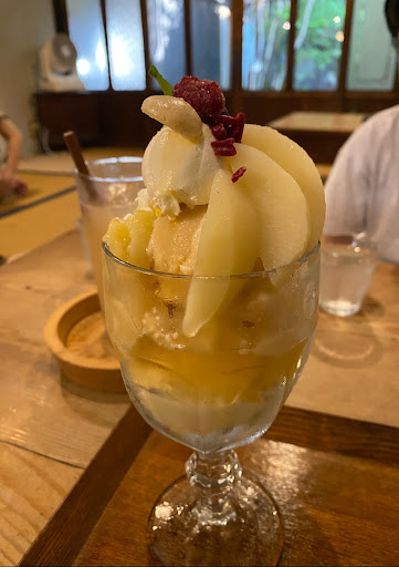 On our little peach quest, we ordered a peach parfait, peach shaved ice and a peach soda to cool down during our late July visit. The staff welcomed us warmly, which already made the stop feel pleasant.