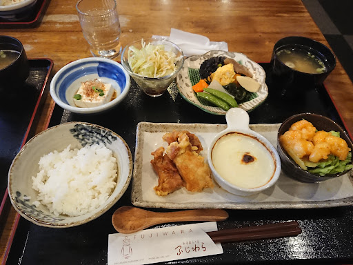 ・ライス ・サラダ (レタスとキャベツ千切り) ・冷奴 (だし醤油にゴマ油少々) ・煮物 (だし巻き玉子と煮物) ・味噌汁 (たぶんインスタント) ・グラタン (コーンとマカロニ少し) ・鶏の唐揚げ (これは日替わり) ・エビチリ (これも日替わり)