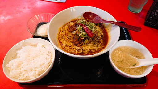 前から気になっていましたが、ようやく来れました。 ザ昭和の町中華という感じのお店です。 汁なし担々麺の満腹セットをお願いしました。 辛さは3辛までありますが、まずは1辛で(^^;) 満腹セットはライスとスープに温泉卵がついてきます。 ランチタイムの11:00~14:00は、ビュッフェコーナーで中華がゆ、スープ、ドリンクが無料になってました。 さほど待つこともなく提供されて、汁なし担々麺を食べると程よい辛さでツルツルいけました。 中華スープもやさしい味で美味しかったです。 残ったタレミンチにライスを入れて混ぜると、山椒の痺れと唐辛子の辛味がガツンときました。 麺を食べるときは良く混ぜてなかったみたいです(^^;) 温泉卵を入れると、まろやかになりました。 お客さんも次々と来て、人気のあるお店なんだなと思いました。 ごちそうさまでした。 美...