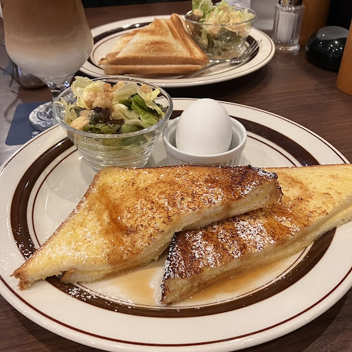 フレンチトーストはサンドイッチ用の薄いパンを2枚重ねて焼いていて フワフワしてこちらも美味しかったです。パンのみみがカリカリで子供は 苦手なみみも完食。サラダとゆで卵もついてました。