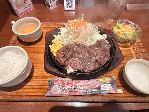 先にボリューム感たっぷりのお肉ガッツリ派は向かない(食事の予算を上げれば多少改善1人予算1098円〜1500円位)、低予算(クーポンが有れば)で食事が出来るがクーポン券が無いと割高に感じてしまう推しのメニューは毎月クーポンで有るお一人様限定メニュー焼きたてハンバーグ120g(大豆肉と牛肉ミンチ肉肉汁感はない)健康バークビーフ120g(脂身なしサガリ肉)両方小サラダ小スープ付き税込548円で多少お得感は感じられる後クーポンない人向け低予算の平日限定の日替わりランチと120g小サラダ小スープ無しがオススメ毎週火曜日はハンバーグの日チーズハンバーグ180g木曜日はステーキの日健康バークビーフ150g両方税込1098円他やわらか仔羊モモステーキ100g他新メニューサガリ肉やわらかステーキ120g両方税込1098円焼肉風カルビステーキ小スープ小サラダ付き150g税込1518円厚切り洋食屋のガーリックバターのポークステーキ小サラダ小スープ付き220g税込988円牛肉たっぷりハンバーグステーキ180g税込1408円黒毛サーロインステーキ税込2638円個人的低予算の範囲オススメはワンコインとまでは行かないが1人様限定メニュー548円と厚切り洋食屋のガーリックバターポークステーキ220g小スープ小サラダ付き988円(220gで988円は納得だが脂身ジューシーな部分を感じる事はなかった)ご飯とドリンクおかわり無料(コーヒーお茶系のみジュース系はない)無料とスタンプ集める事でアイス&生ハムサラダ&500円引きも含め星3最後サラダ以外のメニューは鉄板焼きメニューなので油が弾くのは紙エプロンでしのげるが焼肉臭は防げ無い衣服に焼肉臭が付着するのでお気に入りの服や高め...