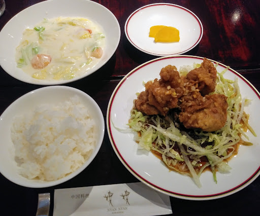 昼は、日替わりランチが安価です。 単品も数種類あるので、日替わりのメニューが苦手なものであっても安心です。 日替わりランチ、この日は、油淋鶏、えびと白菜のクリーム煮。油淋鶏のお酢が少しきつかったです。噎せました。