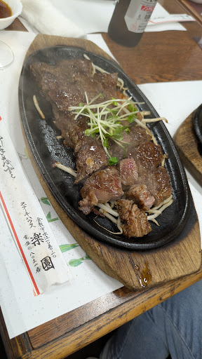 Read more楽園ステーキ5800円 横幅20cm を超え、厚みも十分なボリュームたっぷりステーキです。しかも小分けに切り分けてくれているので食べやすい。 焼き方はミディアムレア。中に赤みを残しながら、外はカリッと強めな焼き上げです 部分的に硬めのところ、脂身が多いところなどありますが、美味しいです。 特製タレの辛味もよく、もやしなど野菜も美味しく炒められてます。 何より特筆すべきは店主の圧巻ファイヤーパフォーマンス🔥 著名な...