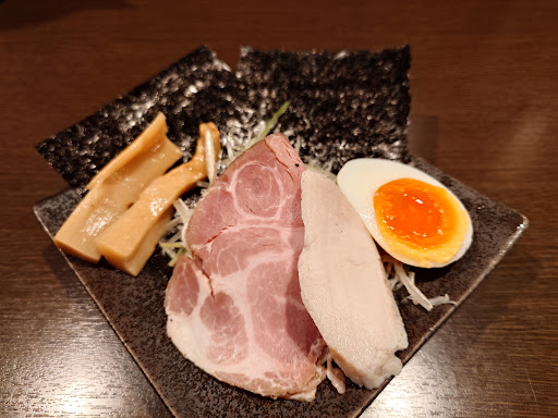 ぶっちゃけ具の全てがマッチしてて美味い 半熟卵は固さ加減が最高でプリプリ めんまは厚さと歯応えで合間の楽しみが出来る チャーシューは追加メニューがあるほどにおすすめされる美味しさ ローストビーフのようなしっかりとした歯応えと風味がスープと合う ネギは青い部分が少ないので青臭さがなく、白髪ネギのシャキシャキした新鮮さで 次から次へと麺とスープが欲しくなる口になる
