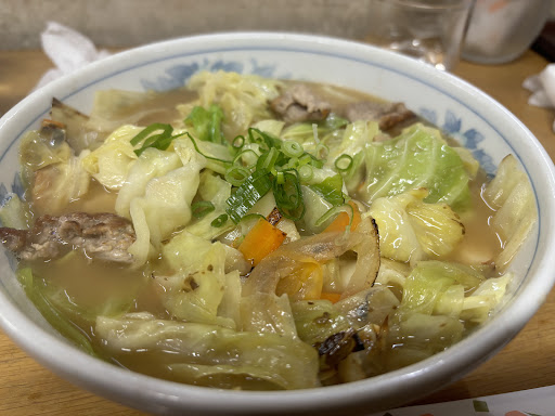 スープは醤油ベースですが野菜出汁が加わって少し甘い味わいになっています。麺は中サイズストレート、デフォでやわらかいですがちゃんぽん麺では一般的でしょう。各種野菜の他に豚肉・アサリ・木耳もしっかり、家庭的な印象も受けますが素材の旨味が渾然一体となってレベルの高いちゃんぽん麺でありました(^^)