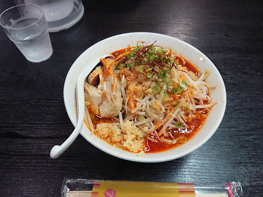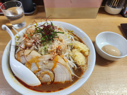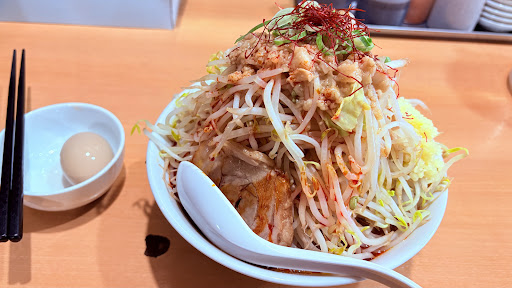 Read more二郎系を求め遠路遥々やって参りました! 皆さんの口コミをもとに、野菜4倍をどのようにして食べてやろうと作戦を立ててきました! さて!いざ参る!と立ち寄ると、11時過ぎには既に駐車場満車〜なんと!平日でもこんなにもお客さんがいるのかと心に思う。 期待を込め駐車場が一つ空き車を停め入店。 さてと、食券を探すも無く、現在は店員さんによる接客に変更されているようだ。 私の作戦では、少ラーメンにましましをと思っていたが、現在は少ラーメン等はなく、普通、肉、大肉と、ラーメン、魔王、まぜめん、三種類のメニューとなっているらしい。 あと、どろラー油は無くなっているみたい。 おっさんに普通盛りにましましは行けるのか!?と思いつつも勢いよく野菜4倍!太麺、かため、アブラ多め、ニンニク多め⤴️と注文! ワクワクしながら待つと、はい!お待ちどう様!と店員さん。 あらま!こ、これは、ヤバいかもしれないと、箸を突っ込む。野菜(もやし)はシャキシャキでうまし! レンゲを潜り込ましスープをするり〜ん〜おっさんには少し甘いかな? しかし、旨さには変わりなし! 野菜を片付けた時には既におっさん腹メーターは、半分ちょい····ヤバい···· いかん、ホンマにいかん!残したら店の人に悪い!!と、○王拳3べーだー!!気合を込め箸をすすめ、なんとか完食⤴️ (勢いでましまししたらいかんと痛感した。) おっさんにはスープが少し甘かったので、次回は魔王のチョイ辛、野菜2倍(ちゃんと反省した)で落ち着...