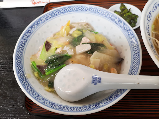 Read more炒飯セット¥800 駐車場は敷地内に約8台分。 土曜日の昼時に訪れ、客は絶えず数組が入れ替わりで入ってきてそれなりに繁盛はしてそう。 年配の夫婦が切り盛りしていて接客はごく普通。ただスピーディな対応できなく、注文から提供までもだいぶ遅かった。メニューはラーメン550円〜と安く、定食、セットメニューも千円以下で食べられリーズナブルな設定。 先に到着したセットのラーメンは、鶏ガラのコクを感じるシンプルな味わい。少し塩気が多い気がするけど値段以上の味ではある。ちょっと遅れて出された炒飯は、お茶碗大盛り分ぐらいの量でミニサイズ。強い火力で米を炒めた焦がしの風味がよく香り、油少なめふっくらした仕上がりでなかなか美味しかった。味つけもちょうど良く、これは炒飯だけでもまた食べたいかも。 長らくメニューの値段を上げずに営業していてそうで好感が持てる。The町中華といった気取らない味...
