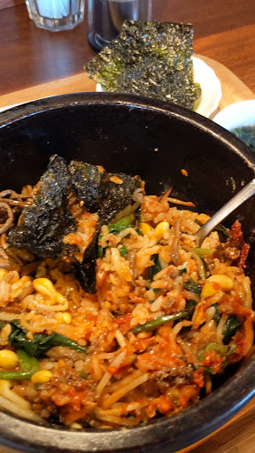 内径17センチの石焼き丼が、ジュージュー言いながらすぐにやってきました。 添えの唐辛子ペーストを加えて混ぜます混ぜます🌀 全般甘酸っぱく感じる味付けですね。 トッピングもナムル、ほうれん草、豆もやし と多彩。 丼に焦げて張り付いた「おこげご飯」がまた香ばしくって美味しいです😋 韓国のりで巻いて食べても、のりの風味がとても良い👍