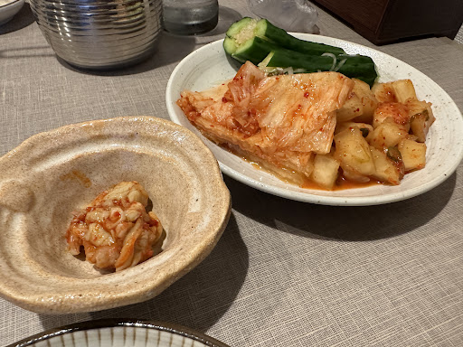 ぐるナビでは怖いとか威圧的と書かれていたが爽やかな青年と清潔感があり物腰柔らかなご主人がお出迎え。店内はフレンチの雰囲気でロースターがなければ信じてしまいそうです。注文はおすすめの和牛3種盛りとタン、ホルモン、ライス、キムチ、わかめスープ。 和牛3種盛りは部位によって切り方が工夫されていて丁寧な仕事ぶりが伺えます。肉は切り方一つでこんなにも味わいが変わるのかと驚かれるでしょう。おすすめです。タンもうすすぎず厚すぎず絶妙な厚さ。配膳された時に2人前かと思う程、量がありました。ホルモンは臭みもなくあっという間になくなりました。ご飯がとびきり美味しかったです。ここは白米をお試しください。本当に美味しい。丁寧な仕事はキムチにもあらわれます。1枚の葉を大きさを揃えて出されます。今日日は雑に切っただけのお店が多い中、感動しました。岡山はちょくちょく...