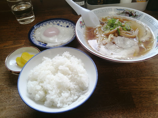 で、出てきたのが写真の「中華そばと白飯と香物、目玉焼き」の組み合わせ。 「え、なにこれ?これ定食?」と思いつつメニューを見返すと。