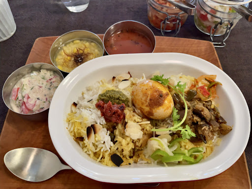 伝建地区は江戸後期から大正初期の雰囲気を残すところ、お店に入ると更に時代を遡り、密教からヒンドゥーに移行しつつあった7世紀インドの喧騒に居合わせた気分になりましょう。おすすめはサグとエビ、二種のカレーセットです。ミニサラダと二種のご飯,あわせて五点がお皿に収まる様子は,まるで曼荼羅です.
