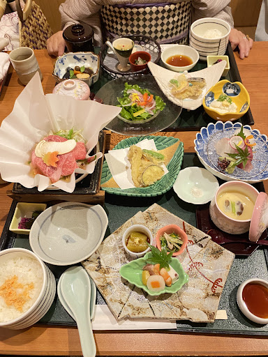 お膳が運ばれてきましたが、盛り付けも美しく品数も多くて最高‼️松茸和牛鍋で秋の味覚を満喫🍁味付けも良かったです。 お造り、天ぷら、茶碗蒸しなど一通り付いていてお腹もいい感じになりました。
