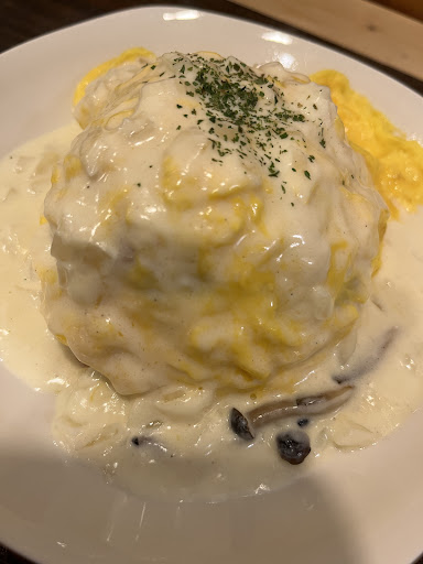 次に小ムライスとオムライスがきました。小ムライスはごはんの量が普通のオムライスの6割くらいとのことでしたが、ボリュームあり食べ終わる頃にはおなかいっぱいになりました。いただいたホワイトソースが食べやすかったことと、ライスの水加減もちょうどよく飽きることなくいただけました。