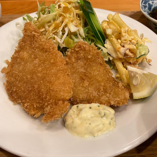 メンタイは熱々で衣サクサク 身はホクホク お菓子みたい 2切れじゃ足りないくらいの軽さ タルタルもいいですがやっぱ ソースですね