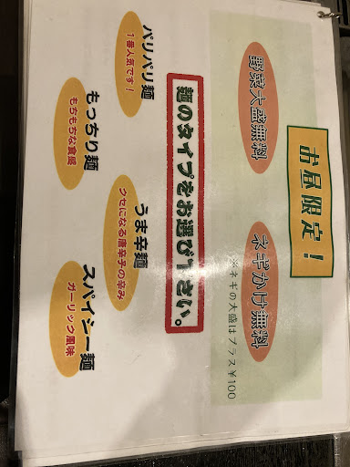 めんのタイプは注文時には聞かれなかったのですが後でメニュー表に選べるのを知って、聞いてくれたら嬉しかったなと思いました。何も言わないとパリパリ麺が選ばれていると思います。