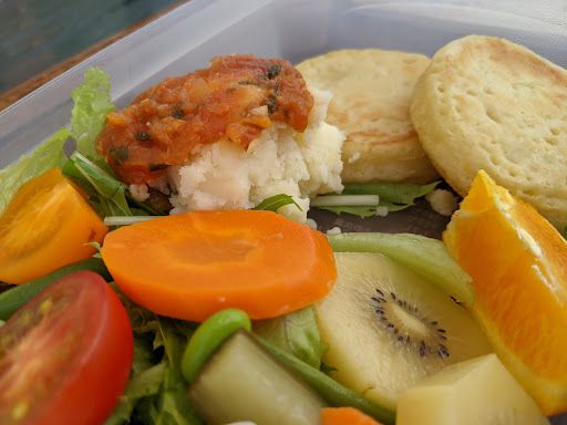 The vegan bento for 1000 yen in a reusable Tupperware filled with handmade English muffins, fresh salad and fruit as well as ratatouille over mashed potatoes. Light...
