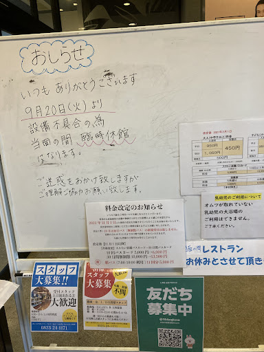 平日、孫(4歳)連れで二回目、再来店しました。 前回は術後直ぐで風呂に入らなかったのですが、傷も癒え、岩盤浴なしコース950円で。 岩盤浴にも入れるコースだと、リーズナブルですが、お風呂だけのコースで入るには、『調整中』と施設の痛みが酷すぎて、950円とは…😭😭😭(涙)