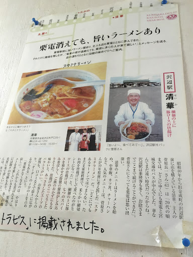 Read more先日、一関の温泉に一泊するために向かう途中に、前々から金成町に、美味しくて評判の高い中華そばの清華さんがあると知っていましたので、せっかくの道中でしたので 家内と立ち寄らせていただきました。 私も家内も、昔ながらの中華そばが好みなので、早速、中華そばと餃子を注文いたしました。直ぐに中華そばがきてひと箸、うん!!! これこれ!この味!この細麺!この茹で加減!妻と顔を合わせ思わずニンマリ!。各出先で中華そばをいただきますが久しぶりの大ヒット!餃子も、モチモチ感いっぱいで、とても美味しくいただきました。近い内に必ずリピートしたいとおもいました。女将さんの接客もとても気持ちよく、更に...