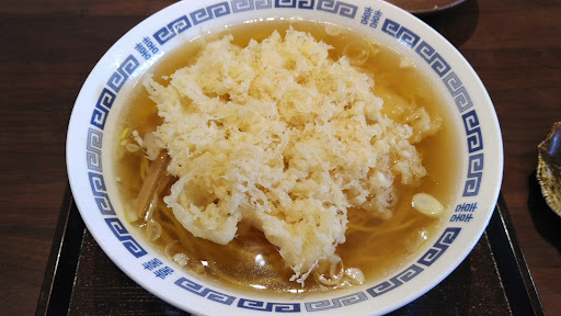 Read more●数年ぶりに、おじゃましました。昼時を若干ずらして来店しましたが、けっこうお客さんが居ましたよ。着座して迷う事なく、天ぷら中華(ノーマルバージョン)・かわりご飯セットをオーダー。 天ぷら中華は、熱々で「ジュージュー」音を立てて着丼。できたて揚げてを、フウフウ言いながら食べました。一口目で、これこれって感じ。安定の美味しさですね。イカは下足ではなく、胴のみ使用。揚げ油も良質なため、最後まで美味しく食べられます。 かわりご飯セット。かわりご飯には、季節感あるばっけ味噌がのってました。野菜サラダも大変凝っていて、味付けはジュレ状のドレッシングでした。 トータル的に、大満足!味・見た目も良く、まさしく和食料理人が作ったものだと分かりますね。接客も丁寧で、気配りがありました。テイクアウトの焼きいかも、柔らかく美味しかったです。また必ず伺います。ごちそうさまでした。