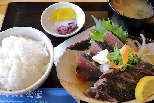 Read more「気軽に楽しめ子連れに優しいセルフ式食堂」 鰹の塩たたき定食をいただきました。私はお塩と薬味で食べる鰹のたたきを想像していたのですが、出てきたのは塩ダレがかかった鰹のたたきでした…確認すればよかったのですが😅。このたたきは少々筋ばったところがあり、もう少し小さく切ってもらえると食べやすいですね。また、塩ダレの味が濃く量も多いので、最後は全てが混ざり合いとてつもなく濃厚な酸味のタレに…そしてお味噌汁もかなり濃い味付けで、味の変化が乏しく逃げ場が無い感じでした。鰹のたたきの量を減らして、もう一品副菜を追加するとちょうどいいかなと思いました。 お昼時には少し早い時間に訪れました。券売機で食券を購入して席で待つスタイルです。セルフサービスなのでお料理は自ら取りに行き、片付けもする必要があります。30人ほど座れる席の多くはお客さんで埋まっていました。座敷の席もあり、子ども用の椅子も用意されています。さらにテラス席もありますね。清潔なダイニングルームをホールスタッフ1人と調理員3人で、テキパキと対応していました。 支払い方法は現金と一部のQRコード決済が使えましたが、残念なことにクレジットカードは使えませんでした。とても広く停めやすい駐車場があるので車での来店が便利です。 今回は少し残念な結果でしたが、これはたまたまだったかもしれません。なぜならサービスは良かったし、人気もあったからです。次は鰹の塩たたき定食と迷った、カツ...