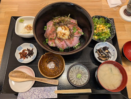感想 (1)低温調理のしっとりローストビーフを特製のタレで頂きます。ごまさば、ごまカンパチのタレの味に近いですが似て非なるもの。美味です。温泉玉子と絡めると良きです。付合せの自家製もちもち豆腐が濃厚で極旨。味噌汁まで隙がありません。