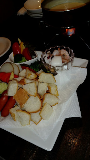 まずコースで出てきたチーズフォンデュ。10分で火消えますからそれまでに食べてくださいと言われ、チーズはパンに絡まないくらい水みたいにサラサラ。友人と火が消えるからと急いで食べないといけないくらいで、追加の火すら貰えない。