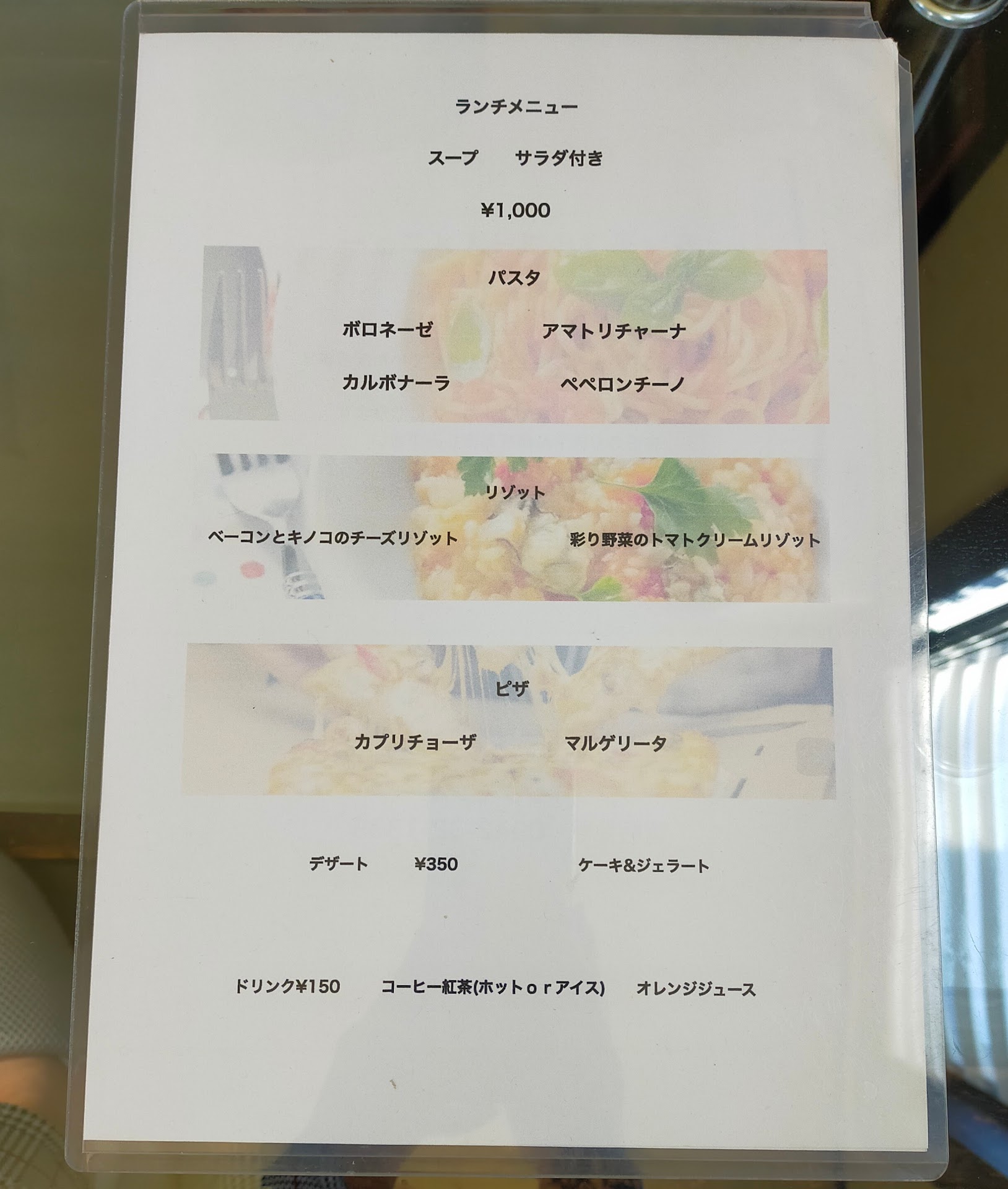 1000円でパスタ5種類くらい、リゾット2種類くらい、ピザ2種類くらいから選べました。サラダ、スープ付です。 定番のメニュー(ペペロンチーノやカルボナーラ、チーズリゾットやマルゲリータ等)ですが、どれも凄く美味しいです。 このお値段は安く感じます。 イタリアンを食べたい時はディナーの時間によく伺っていました。 駐車場ありますし、お店の方もにこにこしてあります。PAYPAYも使えました。 お料理が出てくるのには時間がかかります...