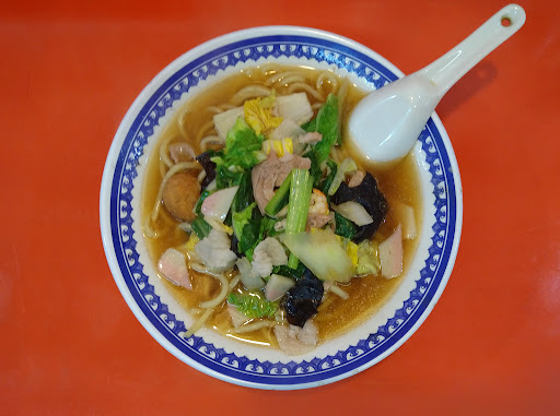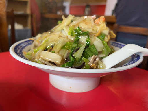 久留米市国分町、国道3号線上の「苅原」交差点から東方向へ150m程進んだ場所にある中華料理店です。ビル1F部分に店舗があり、やや狭めながらも店内はカウンター席·テーブル席·小上がり席及び座敷席が用意されています。2Fには更に団体客用の席もあるのですが、現在使用されているかどうかは分かりません。駐車場は店舗前に直付けで3〜4台駐められる程度ですが、かなり狭いので要注意です。以前は道路を挟んだ正面のスペースや更にその裏側にも駐車スペースが確保されていたのですが、現在はありません。さてラーメンですが、今回は「五目湯麺」を頂きました。あっさり薄味の醤油系スープなのですが、中華料理独特の滋味深い味わいが楽しめます。麺は太麺チャンポン麺が使用されています。具は豚肉、小エビ、白菜、青梗菜、キクラゲ、かまぼこ等といった構成の一杯となっています。どちらかと言うと醤油味チャンポンと言った方が正しいようですね。大盛り対応なし(メニュー表記なし)、替え玉制なしとなっています。麺類のバリエーションは「チャンポン」「皿うどん」「揚げ麺皿うどん」「焼きそば(チャーメン)」「ジャージャー麺」「打留麺(ダールメン)」「汁ビーフン」等々があるのですが、取り分けこの店の看板メニューとなっているのが「皿うどん」です。カリカリ部分としっとり部分の両方が楽しめる太麺皿うどんで、熱々の醤油系の餡が惜しげもなく掛かっており、口内やけど必至の一品となっています。単純に茶色いビジュアルですが、これに黒酢を回し掛けると更に旨さが倍増します。激推ししときます。その他のメニューは「豚のてんぷら」「酢豚」「チンヂャオロース」「マーボー豆腐」「エビチリ」「焼き飯」「焼きギョウザ」等々、中華料理店としてそれなりに用意されていますが、来店の度にメニューの内容が変わっている印象なので、各自で確認して下さい(麺類系はあまり変わりはありませんが、確か大昔は「ラーメン」もあったと記憶してます)。個人的には「肉と玉子の炒りつけ」がマストメニューでした(現在は取り扱いなし)。懐かしいです。 こちらのお店は、1980年代に開業した老舗中華料理店です。昭和テイストの色濃い町中華で、昔から一番人気の「皿うどん」を目当てに通っていました。久しく来店していなかったのですが、いつの間にか代替わりされ、メニューもかなり様変わりしており、昔程の活気も感じられませんでした。少々寂しい雰囲気でしたが、味の方は昔から変わらずの鉄板の町中華が堪能出来ました。この味を残すべく、いつまでも...