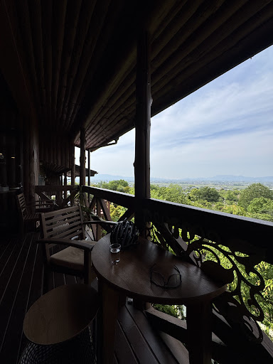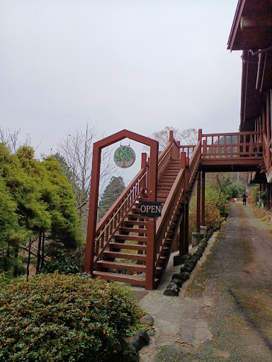 木の階段を登ると入り口があり、そこから入るとお店があります。 可愛いロッジタイプで、確かに眺めが良かったです。