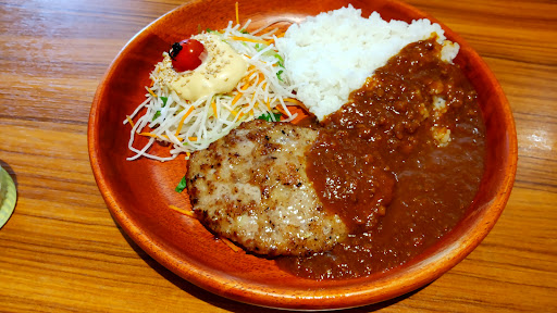 続いて連れのオーダーしたカレーバーグを少しいただきました。 こちらは万人受けを狙っているのでしょうか、カレーはほんのりスパイスが感じられる程度で、辛いものが苦手な方でも美味しくいただける味となっています。 何よりも定番のハンバーグにソースとしても主役としても食べられるカレーがついていることで二種類の食べ方を味わえるのは少しリッチな感じがしました(笑)