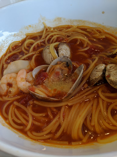 しらすと明太子のパスタ ちょっと量は少ないかな、と思いましたが 味の方は美味しいです。しらすと明太子の 相性は抜群です。スープバーのスープも 美味しくてビックリしましたね。