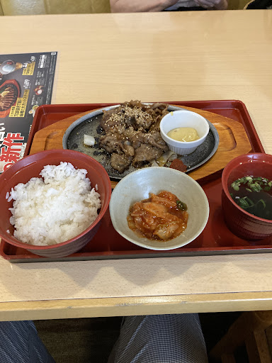 ファミレス九州随一の店舗数と和洋中バラエティに富んだメニュー展開で、曜日を問わず人気店。 ただ、その来客数と店舗サイズに対して、スタッフ不足が常態化。とくにフロアスタッフが、案内からオーダー、食事の提供とレジまで切り盛りして大変そう…パートかアルバイトさんでしょうけど気の毒に思う。 お味やサービス、お店の雰囲気を求め評価するのは野暮というもの。 ファミレスですから、そこはファミレスのレベルで5段階評価の100点満点中の60点で十分なレベル。 今日のオーダー、焼き肉定食は?チープな町定食屋で庶民が月に一度の贅沢って風情。 控えめに添えられた、コチジャンとマスタードで味変も楽しめ、意外な...
