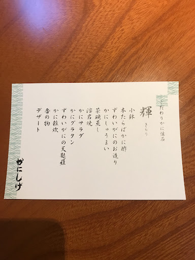 小鉢★★★ ごまどうふ ずわいがにのお造り★★★ 小ぶりの爪が2つ、足が1つ 煮物★★★ かにのセイロ蒸し★ 小さな足2つ、つめが1つ、胴が2つ 小さくて食べづらくいまいち。 ズワイガニの溶岩焼き★★★★ ズワイガニ足1つ、えび1つ、ホタテ1つ 普段どおり、間違いないおいしさ 茶碗蒸し★★★ ずわいがにの天ぷら★★★ 小ぶりのズワイガニ1つ、野菜2つ 物足りない かに汁★★★★ これはいつでもかにの出汁が効いて美味しい 不味いわけはない 飯物★★★ 炊き込みご飯です 香の物★★★ たくあんなどさっぱりした味 デザートとコーヒー★★★ パフェは普通