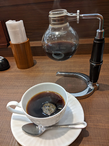 先に着席して注文するスタイル。 今日はひとりランチで利用。 正直ランチのお値段としては高い。 お腹は空いていたけど、あまり食べられそうになかったのでホットサンドを注文。 ホットサンドと小さな器に入ったサラダとデミタスカップに入ったスープがワンプレートになっている。 ちょうどお昼時でもあったけど提供までにけっこう時間がかかる。 でも出てきたものを見ると納得。 作り置きではなくおそらく注文が入っていちから作ってあると思う。 熱々で美味しかった! セットのコーヒーはご一緒にいいですか?と注文の際に聞かれたので「はい」と答えていたが、コーヒーだけが先にきてフードの提供までに時間が空いたので、サイフォンに残っていたおかわり分は食後に飲むと冷め...