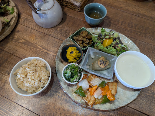 Read moreヘルシーランチが食べたくて検索したところマクロビオティックのお店があったので行ってみることに。 駐車場はお店の前とお店の車線反対側の奥にあります。 ランチメニューは飛び込みだと1500円のプレートしかないようです。 内装は古民家的で落ち着きのある空間で、マダム達が多かったです。常連さんが多いようで、たまにこっちの接客そっちのけでずっと話してるのはちょっと嫌だなと思いました。 サラダのドレッシングもカリフラワーのスープも美味しくて、ひえのフライは本当の魚のようでした。野菜を沢山食べれるのは嬉しいですが、ご飯が進む味付けではなかったかな。玄米自体が美味しかったので単体でも食べれましたが、どうせならおかずでご飯食べたかったです。豆乳プリンはきな粉と黒蜜で和風ですが、とても美味しかったです。 支払いは現金のみでしたので最近の感覚では電子マネーで現金不要な事が多いのでちょっと残念でした。 でも、ヘルシーでしたが、ちゃんとお腹いっぱいになりました。レジ前の雑貨も可愛かった...