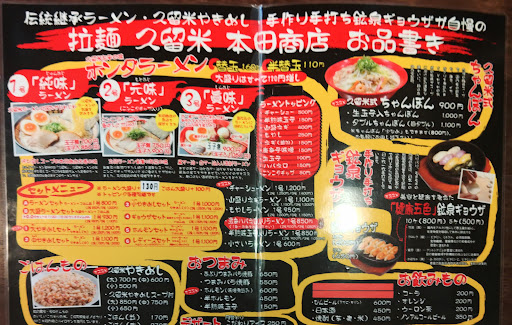 Read more久留米市南、福岡県道758号線沿いにあるラーメン屋です。店内はカウンター席・テーブル席・小上がり席と完備されており、十分収客出来そうです。駐車場は店前に確保されていますが、客の出入りも多いので、時間帯によってはすぐに満車となってしまうのが難点と言えば難点ですね。さてラーメンですが、この店では1号「純味」ラーメン、2号「元味」ラーメン、3号「眞味」ラーメンの三種類が基本となっています。呼び戻しスープは優しい甘味とともに、色味も味わいもこってり濃厚で豚骨臭もしっかりあるのですが、クドさはありませんね。麺は自家製の中細ストレートで、しっとりモチモチとしています。具はしっとり系のチャーシュー、キクラゲ、ネギ、海苔といった構成の一杯です。今回頂いた1号「純味」は最も基本的な構成となっていますが、2号「元味」はニンニクチップ入り、3号「眞味」は黒マー油・白マー油・唐辛子みそ入りとなっています。その他には「久留米式ちゃんぽん」をはじめ、サイドメニューやセットメニューが豊富に展開されています。中でも熱々の鉄鍋に盛られた「鉱泉ギョウザ」は独特のモチモチとした食感に仕上げられています。お薦めしときます。 2010年開業のこちらのお店は、屋号は江戸時代から続く履物総合卸問屋「本田商店」から、ラーメンは筑後市の「筑後丸福」(既に閉業)をルーツに持つそうです。店内は活気があり、スタッフの対応も親切で気持ち良く利用できるラーメン屋です。そのお陰か、大通りからはやや奥まった立地なのに客足が絶え...