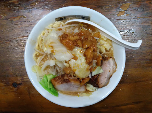 Read more豚骨ラーメンが美味しくて評判のラーメン屋。11時開店後すぐに駐車場が埋まる人気店。二郎っぽい「豪快とんこつ」が気になり食べに行った。 店の内装は綺麗でいかにも今風のラーメン屋という感じ。豪快とんこつはこの店舗限定でかつては平日数量限定だったということなので主力は普通のラーメンだと思っていたら他の客も多くが豪快とんこつを注文していた。 豪快とんこつを麺大盛りで注文。野菜とにんにくのみマシ可で野菜のみマシで注文。別に脂たまごも注文し更に300円の餃子とライスのセットも追加。 出てきたラーメンは麺大盛りで一般的な二郎系の大くらいのボリューム。野菜は一般的なマシと同じかちょっと多いくらい。ただ脂はやはり少なめ。 脂たまごを注文したのは正解と思いきや生卵の白身も入っていてこれはあまりよろしくなかった。有料だけど脂のみマシも可能だったのでそっちにすればよかった。 麺は太さはちゃんぽんくらいで二郎系よりは細い。二郎っぽいワシワシ感はあるけど二郎系と思って食べると違和感がある。 スープは二郎系というより普通の豚骨醤油。二郎系と違ってスルスル飲める普通に美味しいスープ。 チャーシューは1cm弱の厚さと分厚いのが1つずつ入っている。しっかり味付けされており薄い方は柔らかくて美味しいが厚い方は硬くしっかりしてるのでホロホロ系を期待するとガッカリする。 そもそも二郎系を語っていない「二郎風」のラーメンなので別物と割り切って食べれば美味しいラーメン。二郎系を期待するならほぼ別物なのでお勧めしない。ただ大量の野菜やワシワシの太麺は二郎の味の強烈なスープでないと合わないと感じる。さすが人気店だけあってスープはよく出来てると思うのだけど普通のラーメンには興味がわいたけど豪快とんこつ...