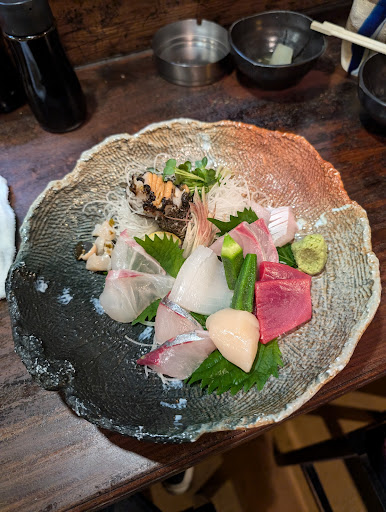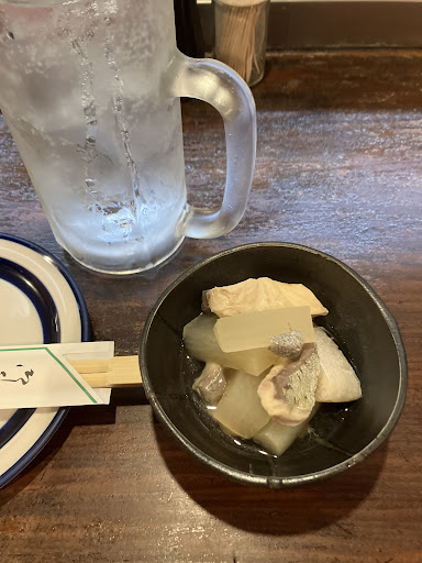 福岡へ出張。定番は博多ですが今回は久留米でした。 相変わらず自由な時間は取れず、朝食べたっきり何も食えず20時チェックイン おーし! 飲むぞー! と街を歩くと…人…少ないね… これはどうやら西鉄久留米駅から離れるように歩いた方が良さそうだ! って事です予想通りいい雰囲気になってきました! そこで見つけたこちらのお店! カウンター6席程に小上がりが4卓位かな カウンター前は魚の切り身を入れるショーケースとそれとは別に氷に上がった魚、貝がドンっと置いてあります。その隣におばんざいが2品程。 雰囲気めっちゃいいじゃん!! 2軒目だったので麦焼酎ソーダ割からスタート 1軒目に行ったとこもそうでしたがいいちこ置いてないね。基本二階堂。久留米はいいちこ置かないのかな?たまたまかな? 来た焼酎がジョッキに並々で嬉スィー! また濃さが絶妙で良店の証です。 これだけでほっこり。 そして突き出しは大根と白身魚煮物。(煮物で合ってるのかな?写真のやつです) この突き出しが美味しい!大根の染み具合もそうですが、そもそもの味付けが美味しい。かつお出汁香りと奥から来るほんのり甘い味付け。出汁に秘密が?と思って出汁について聞いてみましたが鰹出汁ですよとのこと って事はこの甘さの正体は恐らく九州の醤油を使った味付けかなと仮説しました。とにかく美味しいです!家でやってみます。 そして刺し盛りを注文!1580円です 現れた刺し盛りは8ネタ2切れずつ入ってます 種類は縞鯵、トロ、タイ、水イカ、ひらす、ホタテ、サザエ、タコ、茗荷、わかめ、大葉、つま あしらいも素晴らしいので紹介します! まず値段安過ぎる。特筆すべきは縞鯵 関東ではまず無理。 当然に美味い!イカは柔らかい甘目タイプ。 トロも本鮪やな。美味い!