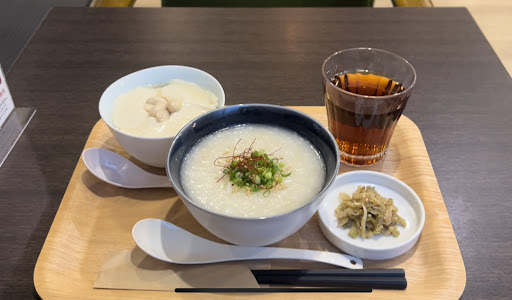 コロナ対策をしっかりされていて小綺麗なお店。 オーダーしたのは、プレーン粥のランチセット お粥が日替わりかプレーンのどちらかのみのチョイスでしたので、プレーンに煮卵をトッピングして 全部で1350円。