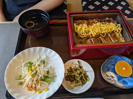お昼ごはんで利用しました。 以前より気になっていたところでした。 初めて利用しました。 お店は久留米高専の近く、小森野橋からくる道路と二千年橋からくる道路が交わるところにあります。 お店は日本家屋的佇まいで内装も日本食を提供されるお店と感じられます。 お店入ったら、滝を思わせる石垣から水が流れ落ちていて、流れ落ちたところには滝つぼ的池があり、そこに鯉(鑑賞用)が泳いでいる、という装飾が施されています。 お店は小上がり席が4席ほどテーブル席が7から8席ほどあります。 メニューには、うなぎ料理はもちろん、鯉料理もあります。 今回は、上うなぎ丼と上せいろ蒸しを注文しました。 まずは、提供いただいたお茶がけっこう美味しかったですね。付き合わせのうなぎの骨のから揚げとともに美味しかったですね。 さて、うなぎの料理ですが、うなぎ自体 いままで食べた中で、初めての食感を感じました。ふわっとした感じではなく、捌いてから焼き上げ、タレをつけて、再び焼くという感じがしました。 タレは少し甘い感じですが、うなぎにはあまり染みていない感じ。 それに、タレをつけたうなぎを焼いている際にタレがコゲていたので、余計にそう感じたのかもしれません。 また、丼については、うなぎをごはんの上にのせてからタレをかけられたようで、少しかけすぎた感じもあります。 国産のうなぎを使用されているからでしょうか、お料理の状況からして、お料理のお値段が少し高いと感じました。 昨今いろんなものが高騰しているから仕方...